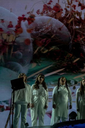 A visually spectacular landscape of lush colours, futuristic screens and wild images of nature that comes alive with Björk's wondrous music, as she performs live alongside musicians and choirs of flutes and voices.