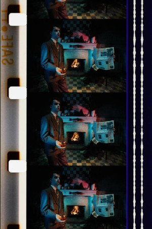 Two men in chairs by the open hearth; photos move in front of their heads.