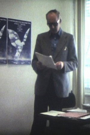 Ulrich Gregor is filmed in his office at the Berlin Film Festival surrounded by the festival's poster (The Great Family of René Magritte).