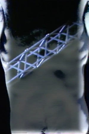 "Goblin's Chants" is a starkly reductive and hypnotic work, structured around a single charged image. Klaus vom Bruch's torso is inscribed with a rotating computer generated construction (in real: a handmade wooden model put on an ordinary turntable); creating a composite image that metaphorically describes a collapse of the private and public space of vitual media. This spectacle of technology imposed on the human body is accompanied by a haunting soundtrack of traditional songs of the Pygmies. Ultimately, the artist turns his butt onto the viewer, communicating with fundamental body language.